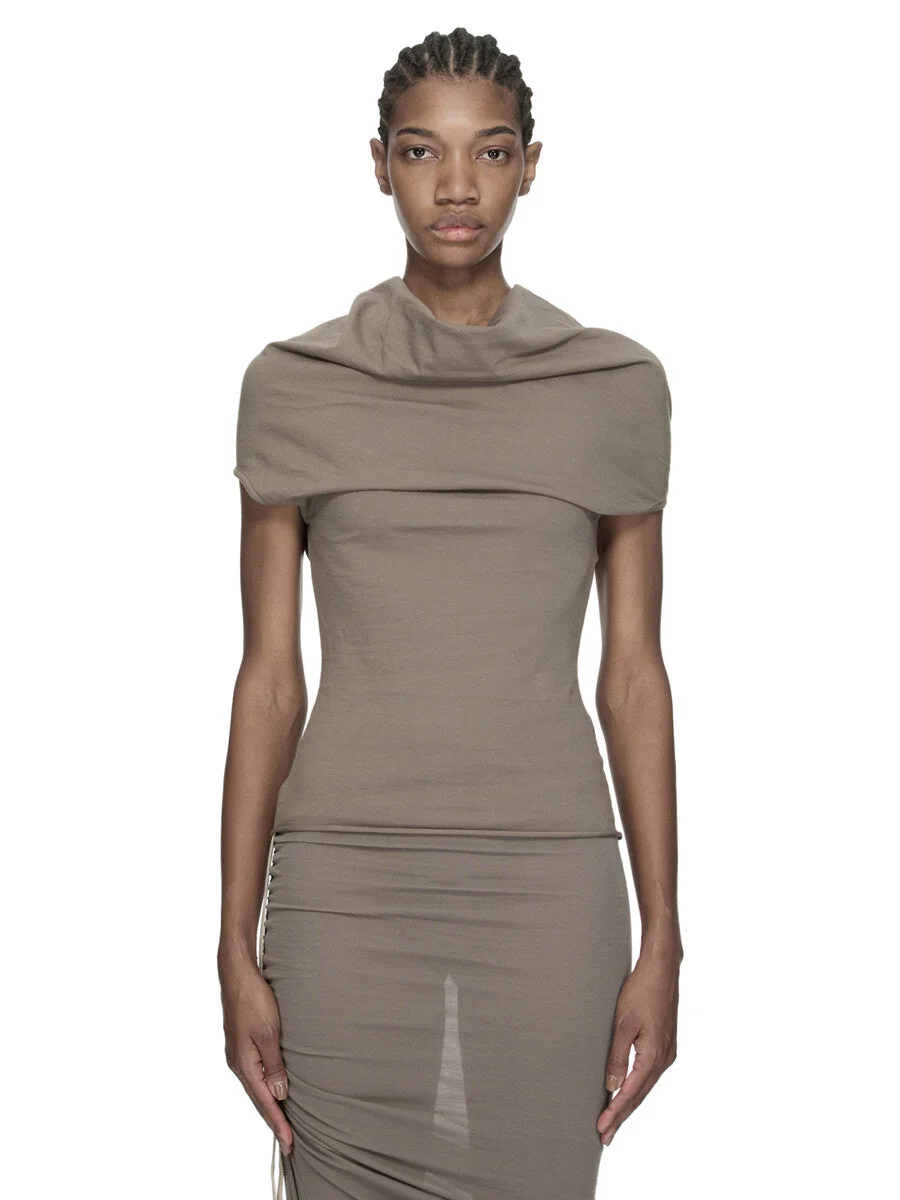 RICK OWENS SS26 TEMPLE SHROUD IN DUST CLASSIC COTTON JERSEY THIS SHROUD IS ABOVE-HIP LENGTH AND FEATURES A DRAPED TUBULAR NECK THAT WIDENS OVER THE SHOULDERS AND CREATES A SHORT FITTED SLEEVE. THIS MEDIUMWEIGHT CLASSIC COTTON JERSEY IS COMPACT WITH A DRY HANDFEEL. THIS JERSEY IS MADE USING GOTS CERTIFIED ORGANIC COTTON WHICH MEANS THE NATURAL FIBER IS GROWN WITHOUT HARMFUL CHEMICALS, LEAVING OUR SOIL, AIR AND WATER CLEANER FROM CONTAMINATES. WE STRIVE TO KEEP OUR PRODUCTION AS LOCAL AS POSSIBLE. THE FULL MANUFATURING CYCLE OF THIS PRODUCT, FROM THE MATERIAL KNITTING TO SEWING AND FINISHING, WAS UNDERTAKEN CLOSE TO OUR HOME BASE IN CONCORDIA, ITALY. COLOR: DUST MATERIAL:100% COTTON MODEL IS 181CM TALL MODEL WEARS SIZE 40
