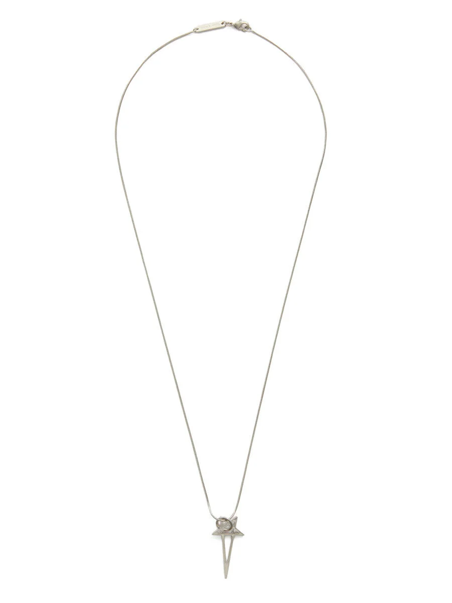 RICK OWENS PENTAGRAM CHARM IN PALLADIO BRASS THIS PENTAGRAM CHARM NECKLACE HAS A SMALL PENTAGRAM CHARM, HANGING FROM A SNAKE CHAIN NECKLACE. IT HAS THE RICK OWENS LOGO ENGRAVED ON A SMALL PLATE ATTACHED TO THE CHAIN AND HOOK CLOSURE THIS JEWELRY PIECE HAS A MATTE DARK BRONZE FINISH. THIS FINISH IS OBTAINED BY DARKENING A BRONZE COLOR GALVANIZATION, THE RESULT IS IRREGULAR MEANING EACH PIECE HAVE ITS OWN UNIQUE SHADINGS. - COLOR: PALLADIO - MATERIAL: 100% BRASS - CHARM LENGTH 3CM / CHAIN DROP 33,5CM
