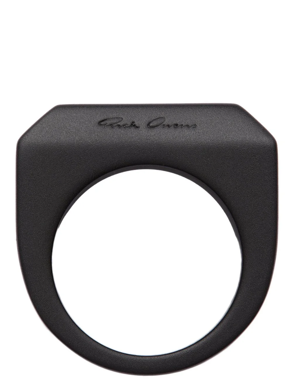RICK OWENS SS24 LIDO BEVELED RING IN BRASS THIS BEVELED RING IS A THICK BAND WITH BEVELED EDGES. IT HAS THE RICK OWENS LOGO ENGRAVED ON THE BACK. THIS JEWLERY PIECE HAS A MATTE BLACK FINISH - COLOR: BLACK - MATERIAL: 100% BRASS - AVAILABLE IN SIZES 52 TO 58 (52-54 SUGGESTED FOR WOMEN AND 56-58 SUGGESTED FOR MEN)