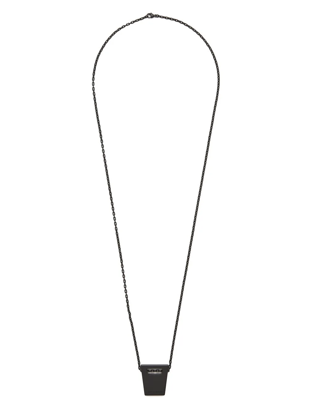 RICK OWENS SS24 LIDO DOGTAG IN BRASS THIS DOGTAG CHARM NECKLACE HAS A SMALL GEOMETRIC TRUNK SHAPED CHARM ENGRAVED WITH SUPERHUMAN, HANGING FROM A CHAIN NECKLACE. IT HAS THE RICK OWENS LOGO ENGRAVED ON THE BACK THIS JEWLERY PIECE HAS A MATTE BLACK FINISH - COLOR: BLACK - MATERIAL: 100% BRASS - CHARM LENGTH 3CM / CHAIN DROP 33,5CM
