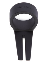 RICK OWENS OPEN TRUNK RING IN BRASS THIS OPEN TRUNK RING IS A THICK BAND WHICH EXTENDS INTO A GEOMETRIC TRUNK SHAPE WITH AN OPEN FACE CENTRE SLIT AND BEVELED EDGES AND THE RICK OWENS LOGO ENGRAVED ON THE BACK. THESE JEWELLERY PIECES ARE CRAFTED WITH THE INDIVIDUAL HANDWORK OF THE ARTISAN, MAKING EACH PIECE UNIQUE. COLOR: BLACK MATERIAL: 100% BRASS