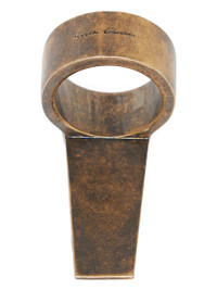 RICK OWENS TRUNK RING IN BRASS THIS TRUNK RING IS A THICK BAND WHICH EXTENDS INTO A GEOMETRIC TRUNK SHAPE WITH BEVELED EDGES. IT HAS THE RICK OWENS LOGO ENGRAVED ON THE BACK. THIS IS THE DARK BRONZE VERSION. THIS JEWELRY PIECE HAS A MATTE DARK BRONZE FINISH. THIS FINISH IS OBTAINED BY DARKENING A BRONZE COLOR GALVANIZATION, THE RESULT IS IRREGULAR MEANING EACH PIECE HAVE ITS OWN UNIQUE SHADINGS. COLOR: DARK BRONZE MATERIAL: 100% BRASS