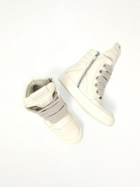 Rick Owens's Jumbolace Geobasket in Milk/Milk/Milk is a striking high-top sneaker that embodies avant-garde design with its unique colorway. This footwear piece is a bold statement, combining luxury and streetwear aesthetics. - Composition: Upper 100%Cow Leather-Lining 100%Calf Leather-Insole 100%Calf Leather-Sole 100%Thermoplastic Rubber- - High-top silhouette with oversized tongue - Distinctive milk colorway for a monochromatic look - Features signature Jumbolace detailing - Chunky rubber sole for added comfort and style - Iconic design synonymous with Rick Owens's avant-garde fashion - Made in Italy SKU: RP02E4898 LCOW2 1111