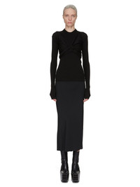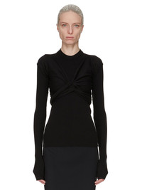 RICK OWENS SS25 HOLLYWOOD CROP WRAP IN BLACK LIGHTWEIGHT RASATO KNIT THIS CROP WRAP IS BELOW-BUST LENGTH WITH LONG SLIM SLEEVES. IT HAS A V NECK THAT DESCENDS INTO LONG TIES THAT ARE DESIGNED TO TWIST, AND WRAP AROUND THE BODY, TYING AT THE BACK THIS LIGHTWEIGHT AND CLASSIC STITCH WOOL KNIT HAS A SOFT HANDFEEL COLOR: BLACK MATERIAL: 100% NEW WOOL MODEL IS 181CM TALL MODEL WEARS SIZE S