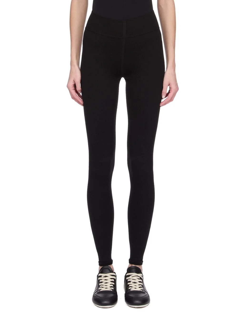 RICK OWENS FW25 CONCORDIANS LEGGINGS IN BLACK LIGHTWEIGHT RASATO KNIT THESE LEGGINGS ARE ABOVE ANKLE LENGTH AND ARE A SKIN TIGHT FIT. THEY ARE A SEAMLESS KNIT WHICH FEATURES A RIBBED WAISTBAND CUFFS AND KNIT GEOMETRIC LINE DETAILS ON THE THIGHS, HIPS AND KNEES THIS LIGHTWEIGHT AND CLASSIC STITCH WOOL KNIT HAS A SOFT HANDFEEL COLOR: BLACK MATERIAL: 100% NEW WOOL MODEL IS 181CM TALL MODEL WEARS SIZE S