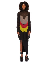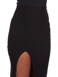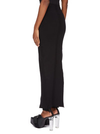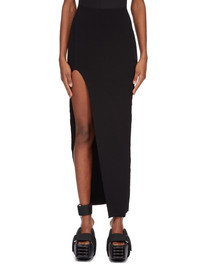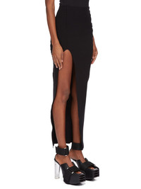 RICK OWENS SS24 LIDO RUNWAY SKIRT IN BLACK STRETCH VISCOSE KNIT THIS SKIRT IS ANKLE LENGTH. IT FEATURES A ROUNDED PANEL WITH AN OUTSIDE FACING SEAM THAT CURVES OVER THE RIGHT HIP TO AN ASYMMETRICAL SLIT THAT BEGINS ON THE LEFT MID-THIGH. IT HAS THE SIGNATURE KNIT LINE RUNNING DOWN THE CENTRE BACK THIS KNIT IS MADE WITH ECOVERO CERTIFIED VISCOSE THAT ENSURES THAT THE FIBERS ARE PRODUCED FROM RESPONSIBLY MANAGED PLANTATIONS AND NO DEFORESTATION OCCURS - COLOR: BLACK - MATERIAL: 63% VISCOSE + 27% POLYESTER + 7% NYLON + 3% ELASTANE - MODEL IS 181CM TALL - MODEL WEARS SIZE S