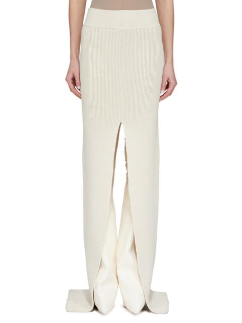 RICK OWENS FW25 CONCORDIANS RUNWAY SLICED SKIRT IN BLACK WOOL THIS SLICED SKIRT IS FLOOR LENGTH AT SIDES. IT HAS AN ELASTICIZED WAISTBAND AND A CLOSE TO THE BODY FIT. IT FEATURES TWO HIGH SLITS FRONT AND BACK. THIS IS A HEAVY WOOL FISHERMAN KNIT. COLOR: BLACK MATERIAL: 100% NEW WOOL MODEL IS 181CM TALL MODEL WEARS SIZE S