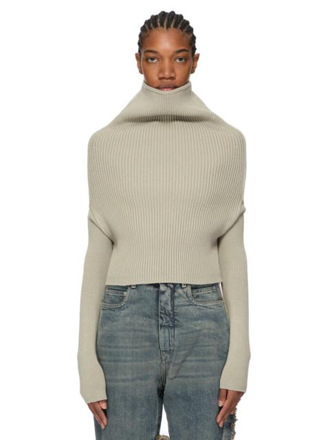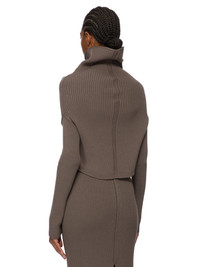 RICK OWENS FW25 CONCORDIANS RUNWAY LS COWL IN DARKDUST WOOL THIS LS COWL IS WAIST LENGTH AT FRONT, DIPPING SLIGHTLY LONGER IN BACK. IT FEATURES A DRAPED TUBULAR NECK THAT WIDENS OVER THE SHOULDERS CREATING A SHORT FITTED BODY WITH LONG SLIM SLEEVES. IT HAS A SIGNATURE KNIT CHANNEL DOWN THE SPINE COLOR: DARKDUST MATERIAL: 100% NEW WOOL MODEL IS 181CM TALL MODEL WEARS SIZE S