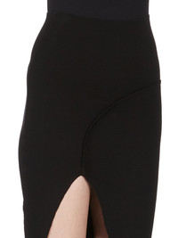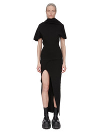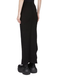 RICK OWENS FW25 CONCORDIANS THERESA SKIRT IN BLACK STRETCH VISCOSE KNIT THIS THERESA SKIRT IS ANKLE LENGTH. IT HAS A ROUNDED PANEL WITH OUTSIDE FACING SEAM, CURVING OVER THE RIGHT HIP TO A RAW CUT ASYMMETRICAL SLIT BEGINNING ON THE LEFT MID-THIGH. IT HAS THE SIGNATURE KNIT LINE RUNNING DOWN THE CENTRE BACK THIS MEDIUMWEIGHT VISCOSE KNIT IS COMPACT WITH A STRETCHY AND DRY HANDFEEL IT IS MADE WITH ECOVERO CERTIFIED VISCOSE WHICH ENSURES THAT THE FIBERS ARE PRODUCED FROM RESPONSIBLY MANAGED PLANTATIONS AND NO DEFORESTATION OCCURS COLOR: BLACK MATERIAL: 63% VISCOSE + 27% POLYESTER + 7% NYLON + 3% ELASTANE MODEL IS 181CM TALL MODEL WEARS SIZE S