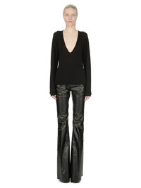 RICK OWENS SS24 LIDO DYLAN SWEATER IN BLACK LIGHT WEIGHT RASATO KNIT THIS DYLAN SWEATER IS HIP LENGTH WITH LONG SLEEVES, IT HAS A DEEP V NECK, RIBBED CUFFS AND WAISTBAND, AND SIGNATURE KNIT CHANNEL RUNNING DOWN THE CENTRE BACK SPINE THIS IS A LIGHTWEIGHT AND SOFT CLASSIC STITCH WOOL KNIT- COLOR: BLACK - MATERIAL: 100% NEW WOOL - MODEL IS 181CM TALL - MODEL WEARS SIZE S