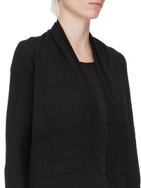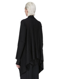 RICK OWENS FOREVER MEDIUM WRAP IN BLACK LIGHTWEIGHT RASATO CASHMERE KNIT THIS MEDIUM WRAP HAS A LOOSE FIT BODY AND LONG CLOSE-TO-THE-BODY SLEEVES. IT HAS AN OPEN FRONT CREATING A DRAPING EFFECT ON FRONT AND BACK. IT IS BELOW-THE-HIP LENGTH AT CENTRE FRONT AND BACK WHICH DIPS DOWN AT THE SIDES. IT HAS A WIDE RIBBED KNIT BORDER ON THE HEM AND FRONT, AND A SIGNATURE KNIT LINE RUNNING DOWN THE CENTRE BACK SPINE THIS IS A LIGHTWEIGHT AND SOFT CLASSIC STITCH CASHMERE KNIT - FLAGSHIP STORES AND ONLINE EXCLUSIVE ITEM - COLOR: BLACK.- MATERIAL: 100% CASHMERE- MODEL IS WEARING SIZE S- MODEL IS 181 CM TALL