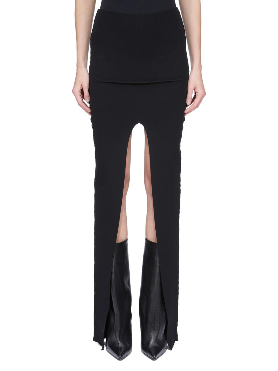 RICK OWENS SS26 TEMPLE SLICED SKIRT IN BLACK STRETCH VISCOSE KNIT THIS SLICED SKIRT IS BELOW ANKLE LENGTH AT SIDES. IT HAS AN ELASTICIZED WAISTBAND A CLOSE TO THE BODY FIT. IT FEATURES TWO HIGH SLITS FRONT AND BACK AS WELL AS A FRONT AND BACK STITCH RIDGE DETAIL. IT HAS SIDE SEAM POCKETS. THIS MEDIUMWEIGHT VISCOSE KNIT IS COMPACT WITH A STRETCHY AND DRY HANDFEEL. IT IS MADE WITH ECOVERO CERTIFIED VISCOSE WHICH ENSURES THAT THE FIBERS ARE PRODUCED FROM RESPONSIBLY MANAGED PLANTATIONS AND NO DEFORESTATION OCCURS. COLOR: BLACK MATERIAL:63% VISCOSE + 27% POLYESTER + 7% NYLON + 3% ELASTANE MODEL IS 181CM TALL MODEL WEARS SIZE S