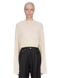 RICK OWENS FW25 CONCORDIANS CROPPED HOODED TUNIC IN NATURAL LIGHTWEIGHT RASATO KNIT THIS CROPPED HOODED TUNIC IS WAIST LENGTH WITH LONG SLEEVES. IT HAS A LARGE HOOD AND A RIBBED KNIT NECK. IT FEATURES A KNIT MOTIVO ON THE FRONT CHEST AND SHOULDERS AND HAS WIDE, SUPPLE, SLEEVES AND A BODY THAT GATHERS AT THE RIBBED WAISTBAND, CREATING ELEGANT DRAPING. IT HAS A SIGNATURE KNIT CHANNEL RUNNING DOWN THE CENTRE BACK SPINE AND A CENTRE FRONT LINE THIS LIGHTWEIGHT AND CLASSIC STITCH WOOL KNIT HAS A SOFT HANDFEEL COLOR: NATURAL MATERIAL: 100% NEW WOOL MODEL IS 181CM TALL MODEL WEARS SIZE S