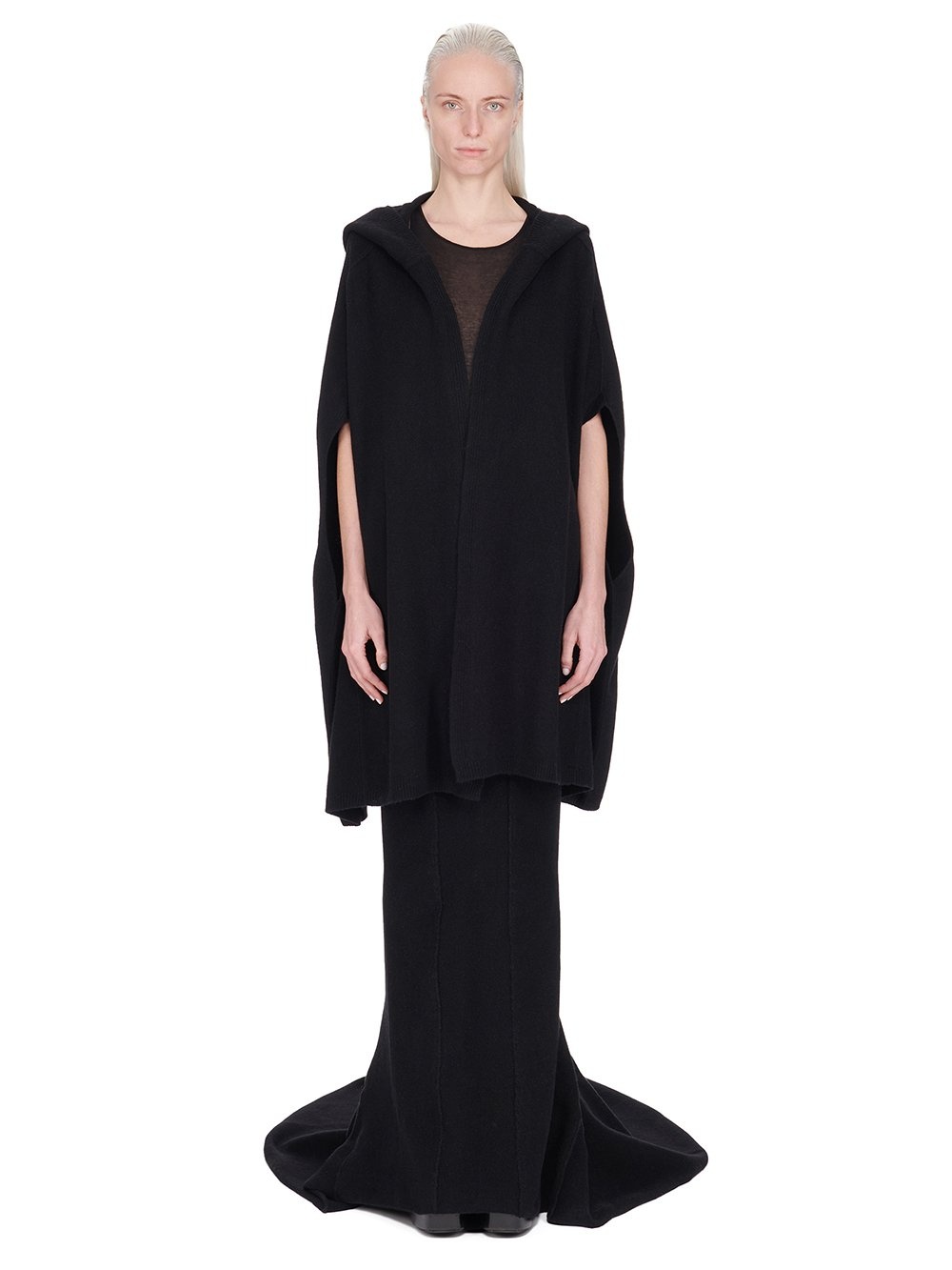 hooded knitted cardi-coat hooded knitted cardi-coat from Rick Owens featuring cashmere blend, fine knit, classic hood, long sleeves, ribbed hem, draped design and black. Composition Cashmere 97%, Wool 3% SIZE & FIT Model measurements Height 5 ft 10 in(1.79 m) Bust/Chest 31.9 in(81 cm) Hips 36.6 in(93 cm) Waist 24.4 in(62 cm) FittingInformation This piece fits true to size. We recommend you get your regular size Cut for a loose fit Made with a mid-weight fabric