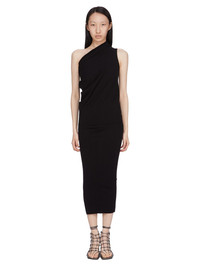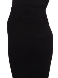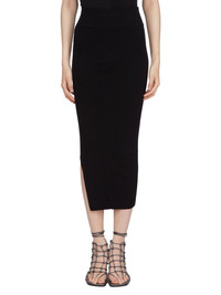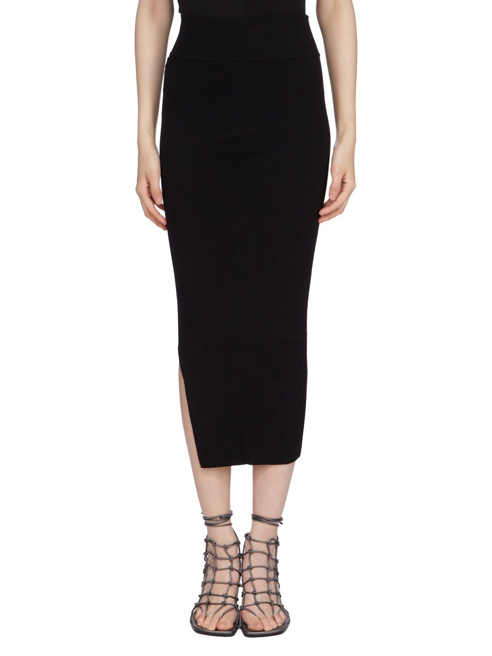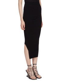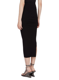 RICK OWENS SS25 HOLLYWOOD CALF SKIRT IN BLACK LIGHTWEIGHT RASATO KNIT THIS CALF SKIRT IS MID-CALF LENGTH, WITH A BODY HUGGING FIT, THAT FLARES SLIGHTLY FROM THE KNEE, WITH A CENTER BACK GODET. IT HAS A WIDE RIBBED WAISTBAND AND A KNIT LINE RUNNING DOWN THE CENTER FRONT AND BACK THIS LIGHTWEIGHT AND CLASSIC STITCH VISCOSE KNIT HAS A SOFT HANDFEEL COLOR: BLACK MATERIAL: 68% VISCOSE + 32% POLYESTER MODEL IS 181CM TALL MODEL WEARS SIZE S