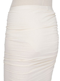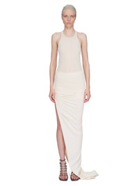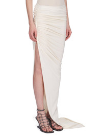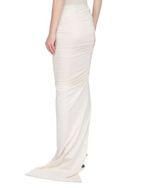 RICK OWENS SS25 HOLLYWOOD EDFU SKIRT IN NATURAL CLASSIC COTTON JERSEY THIS JERSEY EDFU SKIRT TRAILS FLOOR-LENGTH AND HAS A LONG TRAIN. IT HAS AN ELASTICIZED WAISTBAND A TIGHT FIT. IT DRAPES AND WRAPS AROUND THE HIPS, AND GATHERS INTO A SEAM ON THE RIGHT THIGH. IT OPENS TO A HIGH SPLIT AND TAPERS TO A NARROW, FLOOR TRAILING TIP THIS MEDIUMWEIGHT CLASSIC COTTON JERSEY IS COMPACT WITH A DRY HANDFEEL. THIS JERSEY IS MADE USING GOTS CERTIFIED ORGANIC COTTON WHICH MEANS THE NATURAL FIBER IS GROWN WITHOUT HARMFUL CHEMICALS, LEAVING OUR SOIL, AIR AND WATER CLEANER FROM CONTAMINATES WE STRIVE TO KEEP OUR PRODUCTION AS LOCAL AS POSSIBLE. THE FULL MANUFACTURING CYCLE OF THIS PRODUCT, FROM THE MATERIAL KNITTING TO SEWING AND FINISHING, WAS UNDERTAKEN CLOSE TO OUR HOME BASE IN CONCORDIA, ITALY. COLOR: NATURAL MATERIAL: 100% COTTON MODEL IS 181CM TALL MODEL WEARS SIZE 40
