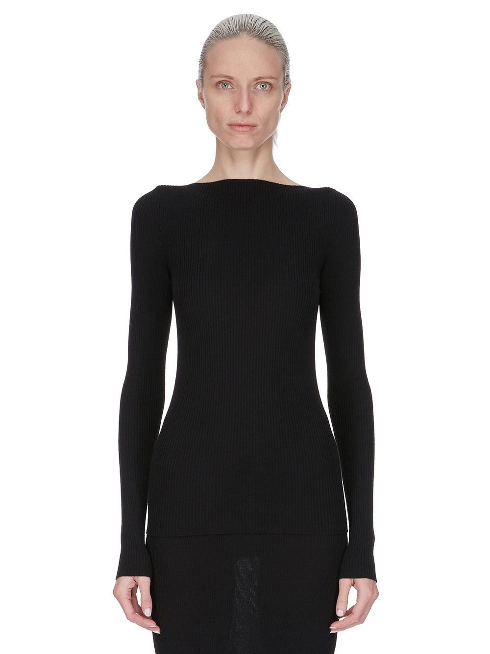 RICK OWENS SS25 HOLLYWOOD AL TOP IN BLACK RIBBED KNIT THIS AL TOP IS HIP LENGTH, WITH A CLOSE FIT AND LONG SLEEVES. IT HAS A WIDE BOAT NECK, AND A ROUND OPENING IN CENTER BACK, WITH THE SIGNATURE KNIT CHANNEL RUNNING DOWN THE LOWER SPINE THIS LIGHTWEIGHT AND CLASSIC RIBBED WOOL KNIT HAS A SOFT HANDFEEL. COLOR: BLACK MATERIAL: 100% NEW WOOL MODEL IS 181CM TALL MODEL WEARS SIZE S