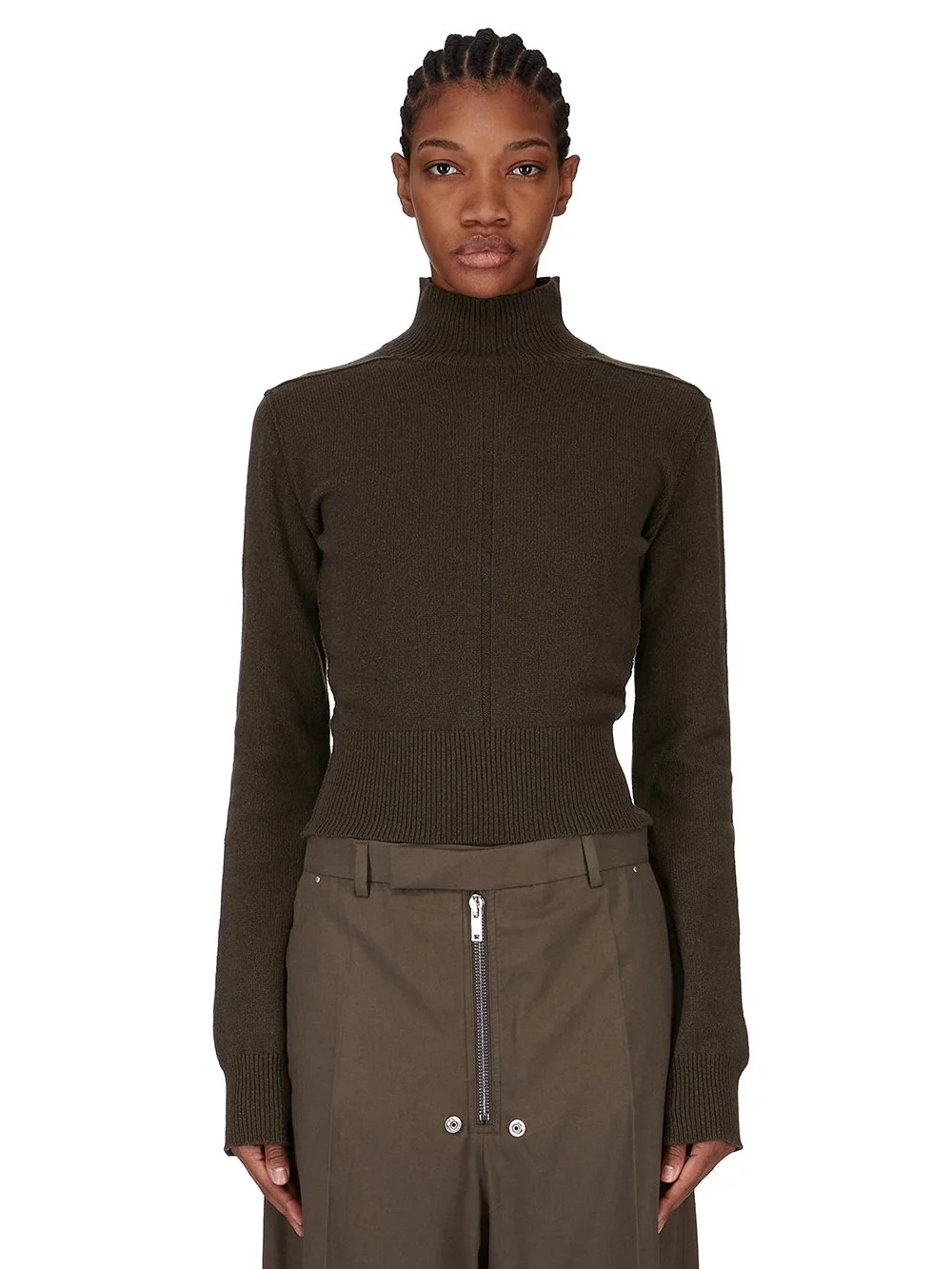 RICK OWENS FW25 CONCORDIANS HEADON PULL IN BOSCO BOILED RECYCLED CASHMERE KNIT THIS HEADON PULL IS ABOVE HIP LENGTH WITH LONG SLEEVES. IT HAS A WIDE LUPETTO NECK, LEVEL SHOULDER SEAMS AND A KNIT LINE RUNNING DOWN THE CENTRE FRONT AND BACK THIS SOFT CASHMERE KNIT IS MADE FROM RECYCLED YARNS COLOR: BOSCO MATERIAL: 97% CASHMERE + 3% WOOL MODEL IS 181CM TALL MODEL WEARS SIZE S