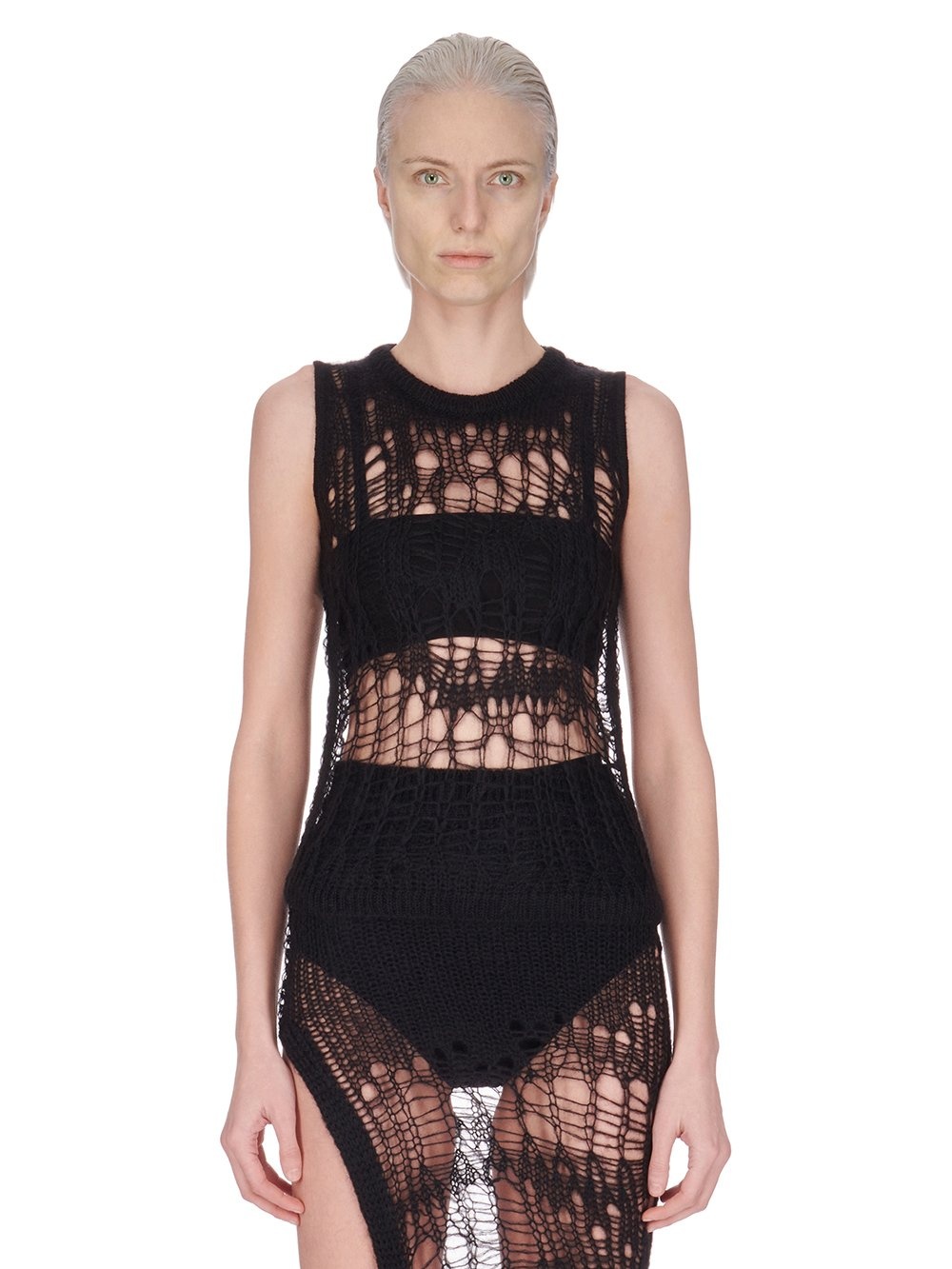RICK OWENS SS24 LIDO SPIDER TANK IN BLACK NET KNIT THIS SPIDER TANK IS ABOVE-HIP LENGTH AND SLEEVELESS WITH WIDE TANK SHOULDERS AND A RIBBED ROUND NECK, AND RIBBED HEMLINE THIS IS A NET KNIT WITH UNEVEN HOLES- COLOR: BLACK - MATERIAL: 50% NYLON + 46% MOHAIR + 4% WOOL - MODEL IS 181CM TALL - MODEL WEARS SIZE S
