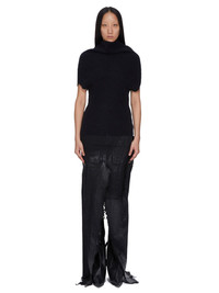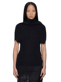RICK OWENS FW25 CONCORDIANS RUNWAY SL CRATER IN BLACK ALPACA KNIT THIS SL CRATER KNIT IS HIP LENGTH WITH A LOOSE FIT. IT HAS A HIGH RIBBED CREW NECK WITH SLIGHT COWL, IT IS SLEEVELESS WITH WIDE SHOULDERS, A DROPPED ARMHOLE AND A RIBBED HEM. IT FEATURES A SIGNATURE KNIT LINE RUNNING DOWN THE CENTRE BACK SPINE THIS IS A DENSE BUT LIGHT KNIT WITH A SOFT SLIGHTLY FLUFFY HAND COLOR: BLACK MATERIAL: 48% ALPACA + 30% NYLON + 20% WOOL + 2% ELASTANE MODEL IS 181CM TALL MODEL WEARS SIZE L