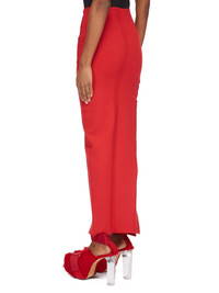 RICK OWENS SS24 LIDO RUNWAY SKIRT IN CARDINAL RED STRETCH VISCOSE KNIT THIS SKIRT IS ANKLE LENGTH. IT FEATURES A ROUNDED PANEL WITH AN OUTSIDE FACING SEAM THAT CURVES OVER THE RIGHT HIP TO AN ASYMMETRICAL SLIT THAT BEGINS ON THE LEFT MID-THIGH. IT HAS THE SIGNATURE KNIT LINE RUNNING DOWN THE CENTRE BACK THIS KNIT IS MADE WITH ECOVERO CERTIFIED VISCOSE THAT ENSURES THAT THE FIBERS ARE PRODUCED FROM RESPONSIBLY MANAGED PLANTATIONS AND NO DEFORESTATION OCCURS - COLOR: CARDINAL RED - MATERIAL: 63% VISCOSE + 27% POLYESTER + 7% NYLON + 3% ELASTANE - MODEL IS 181CM TALL - MODEL WEARS SIZE S