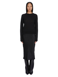 RICK OWENS SS26 TEMPLE BIKER LEVEL IN BLACK LIGHTWEIGHT RASATO KNIT THIS BIKER LEVEL ROUND NECK SWEATER IS ABOVE-HIP LENGTH WITH LONG SLEEVES. IT HAS A RIBBED ROUND NECK, CUFFS AND HEM. IT FEATURES SIGNATURE LEVEL SHOULDER SEAMS AND A KNIT LINE RUNNING DOWN THE CENTER BACK SPINE THIS LIGHTWEIGHT AND CLASSIC STITCH WOOL KNIT HAS A SOFT HANDFEEL COLOR: BLACK MATERIAL:100% NEW WOOL MODEL IS 181CM TALL MODEL WEARS SIZE S