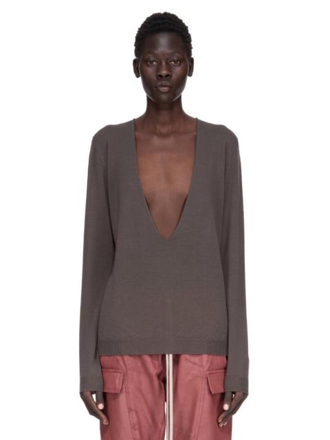 RICK OWENS FW25 CONCORDIANS EXTREME V NECK PULL IN PEARL LIGHTWEIGHT RASATO KNIT THIS EXTREME V NECK PULL IS BELOW HIP LENGTH WITH LONG SLEEVES. IT HAS AN EXTREME DEEP V NECK WITH SLIM KNIT EDGE AND RIBBED HEM AND CUFFS. IT FEATURES A SIGNATURE KNIT LINE RUNNING DOWN THE CENTRE BACK SPINE THIS LIGHTWEIGHT AND CLASSIC STITCH WOOL KNIT HAS A SOFT HANDFEEL COLOR: PEARL MATERIAL: 100% NEW WOOL MODEL IS 181CM TALL MODEL WEARS SIZE S