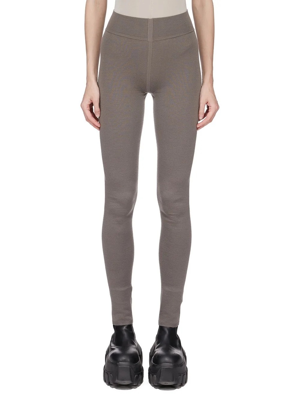 RICK OWENS FW25 CONCORDIANS LEGGINGS IN DUST LIGHTWEIGHT RASATO KNIT THESE LEGGINGS ARE ABOVE ANKLE LENGTH AND ARE A SKIN TIGHT FIT. THEY ARE A SEAMLESS KNIT WHICH FEATURES A RIBBED WAISTBAND CUFFS AND KNIT GEOMETRIC LINE DETAILS ON THE THIGHS, HIPS AND KNEES THIS LIGHTWEIGHT AND CLASSIC STITCH WOOL KNIT HAS A SOFT HANDFEEL COLOR: DUST MATERIAL: 100% NEW WOOL MODEL IS 181CM TALL MODEL WEARS SIZE S