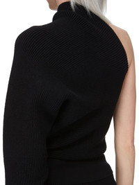 RICK OWENS FW23 LUXOR RUNWAY ONE SLEEVE TOP IN BLACK HEAVY RIB RECYCLED CASHMERE THIS ONE SLEEVE TOP IS HIP LENGTH WITH A TIGHT FIT. IT HAS AN ASYMMETRICAL NECKLINE WITH ONE SHOULDER. IT DRAPES VERY SLIGHTLY ACROSS THE CHEST, BALLOONING INTO A DRAPED SHOULDER WITH A SINGLE LONG, LEFT SLEEVE AND A KNIT WAISTBAND HEAVY RIB RECYCLED CASHMERE - COLOR: BLACK - MATERIAL: 97% CASHMERE + 2% WOOL + 1% ELASTANE - DETAIL 68% VISCOSE + 32% POLYESTER - MODEL IS WEARING SIZE S - MODEL IS 181 CM TALL