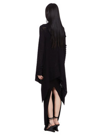 RICK OWENS SS25 HOLLYWOOD MEDIUM WRAP IN BLACK GRID KNIT THIS MEDIUM WRAP IS BELOW-HIP LENGTH AT CENTER FRONT AND BACK, AND DIPS DOWN AT SIDES. IT HAS A LOOSE FIT BODY AND LONG, SLIM SLEEVES. IT HAS AN OPEN FRONT CREATING A DRAPING EFFECT ON FRONT AND BACK. IT FEATURES A SEMI-TRANSPARENT GRID KNIT AND THE SIGNATURE KNIT CHANNEL RUNNING DOWN THE CENTER BACK SPINE THIS MEDIUMWEIGHT WOOL KNIT HAS A SOFT AND FUZZY HANDFEEL. IT IS KNITTED IN AN OPEN RIB PATTERN THAT VARIES THROUGHOUT THE GARMENT. COLOR: BLACK MATERIAL: 64% NEW WOOL + 36% NYLON MODEL IS 181CM TALL MODEL WEARS SIZE S