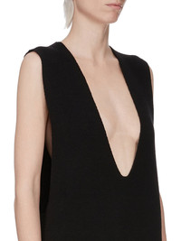RICK OWENS FW25 CONCORDIANS V TANK IN BLACK RECYCLED CASHMERE THIS V TANK IS HIP LENGTH WITH A SQUARE LOOSE FIT. IT IS SLEEVELESS WITH A DEEP V NECKLINE AND LOW CUT ARMHOLES. IT FEATURES THE SIGNATURE KNIT CHANNEL RUNNING DOWN THE SPINE THIS SOFT CASHMERE KNIT IS MADE FROM RECYCLED YARNS COLOR: BLACK MATERIAL: 97% CASHMERE + 3% WOOL MODEL IS 181CM TALL MODEL WEARS SIZE S
