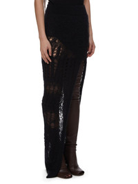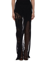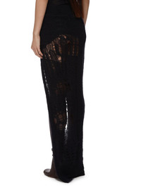 RICK OWENS FW23 LUXOR ZIGGY SKIRT IN BLACK SPIDER KNIT THIS SPIDER ZIGGY SKIRT IS FLOOR LENGTH AND HAS A TAPERED SKIRT WITH A ROUNDED SIDE SPLIT REACHING UP TO JUST ABOVE THE LEFT KNEE. IT HAS A THICK KNIT SPLIT EDGE AND WAISTBAND - COLOR: BLACK - MATERIAL: 50% NYLON + 46% MOHAIR + 4% WOOL - MODEL IS WEARING SIZE S - MODEL IS 181 CM TALL