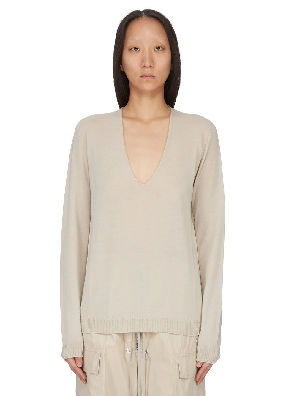 RICK OWENS SS26 TEMPLE V NECK PULL IN SAND LIGHTWEIGHT RASATO KNIT THIS V NECK PULL IS BELOW-HIP LENGTH WITH LONG SLEEVES. IT HAS A DEEP V NECK WITH SLIM KNIT EDGE AND RIBBED HEM AND CUFFS. IT FEATURES A SIGNATURE KNIT LINE RUNNING DOWN THE CENTER BACK SPINE THIS LIGHTWEIGHT AND CLASSIC STITCH WOOL KNIT HAS A SOFT HANDFEEL COLOR: SAND MATERIAL:100% NEW WOOL MODEL IS 181CM TALL MODEL WEARS SIZE S