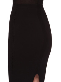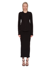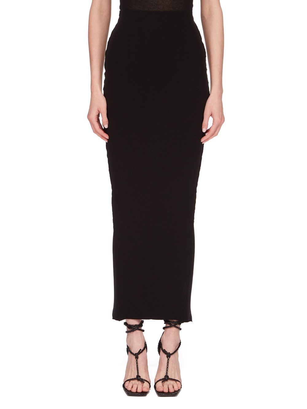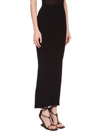 RICK OWENS SS24 LIDO COLUMN SKIRT IN BLACK STRETCH VISCOSE KNIT THIS TANK COLUMN SKIRT IS ANKLE LENGTH WITH A TIGHT FIT. IT HAS A BACK SPLIT TO MID-THIGH, AND THE SIGNATURE KNIT LINE RUNNING DOWN THE CENTRE BACK SKIRT THIS KNIT IS MADE WITH ECOVERO CERTIFIED VISCOSE WHICH ENSURES THAT THE FIBERS ARE PRODUCED FROM RESPONSIBLY MANAGED PLANTATIONS AND NO DEFORESTATION OCCURS - COLOR: BLACK - MATERIAL: 63% VISCOSE + 27% POLYESTER + 7% NYLON + 3% ELASTANE - MODEL IS 181CM TALL - MODEL WEARS SIZE S