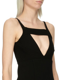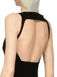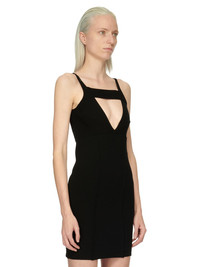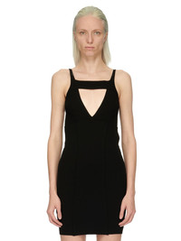 RICK OWENS FW23 LUXOR SLING MINIDRESS IN BLACK STRETCH VISCOSE KNIT THIS SLING MINI DRESS IS MID THIGH LENGTH AND SKIN TIGHT. IT FEATURES A CUTOUT V FRONT WITH A WIDE BAND ACROSS THE CHEST AND SLIM SHOULDER STRAPS, AN OPEN BACK AND A TIGHT SKIRT THIS KNIT IS MADE WITH ECOVERO CERTIFIED VISCOSE WHICH ENSURES THAT THE FIBERS ARE PRODUCED FROM RESPONSIBLY MANAGED PLANTATIONS AND NO DEFORESTATION OCCURS - COLOR: BLACK - MATERIAL: 63% VISCOSE + 27% POLYESTER + 7% NYLON + 3% ELASTANE - MODEL IS WEARING SIZE S - MODEL IS 181 CM TALL