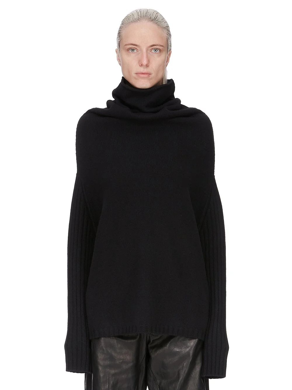 RICK OWENS FW25 CONCORDIANS SHROUD IN BLACK LAS PALMAS CASHMERE KNIT THIS SHROUD IS MID THIGH LENGTH AND FEATURES A DRAPED TUBULAR NECK THAT WIDENS OVER THE SHOULDERS AND FALLS TO LOW ARM HOLES WITH LONG LOOSE SLEEVES. IS HAS A KNIT CHANNEL RUNNING DOWN THE CENTRE BACK THIS HEAVYWEIGHT CASHMERE KNIT HAS A SOFT AND WARM HANDFEEL IT IS KNITTED BOTH IN A CLASSIC RASATO STITCH AND A WIDE RIB COLOR: BLACK MATERIAL: 100% CASHMERE MODEL IS 181CM TALL MODEL WEARS SIZE S