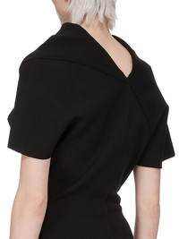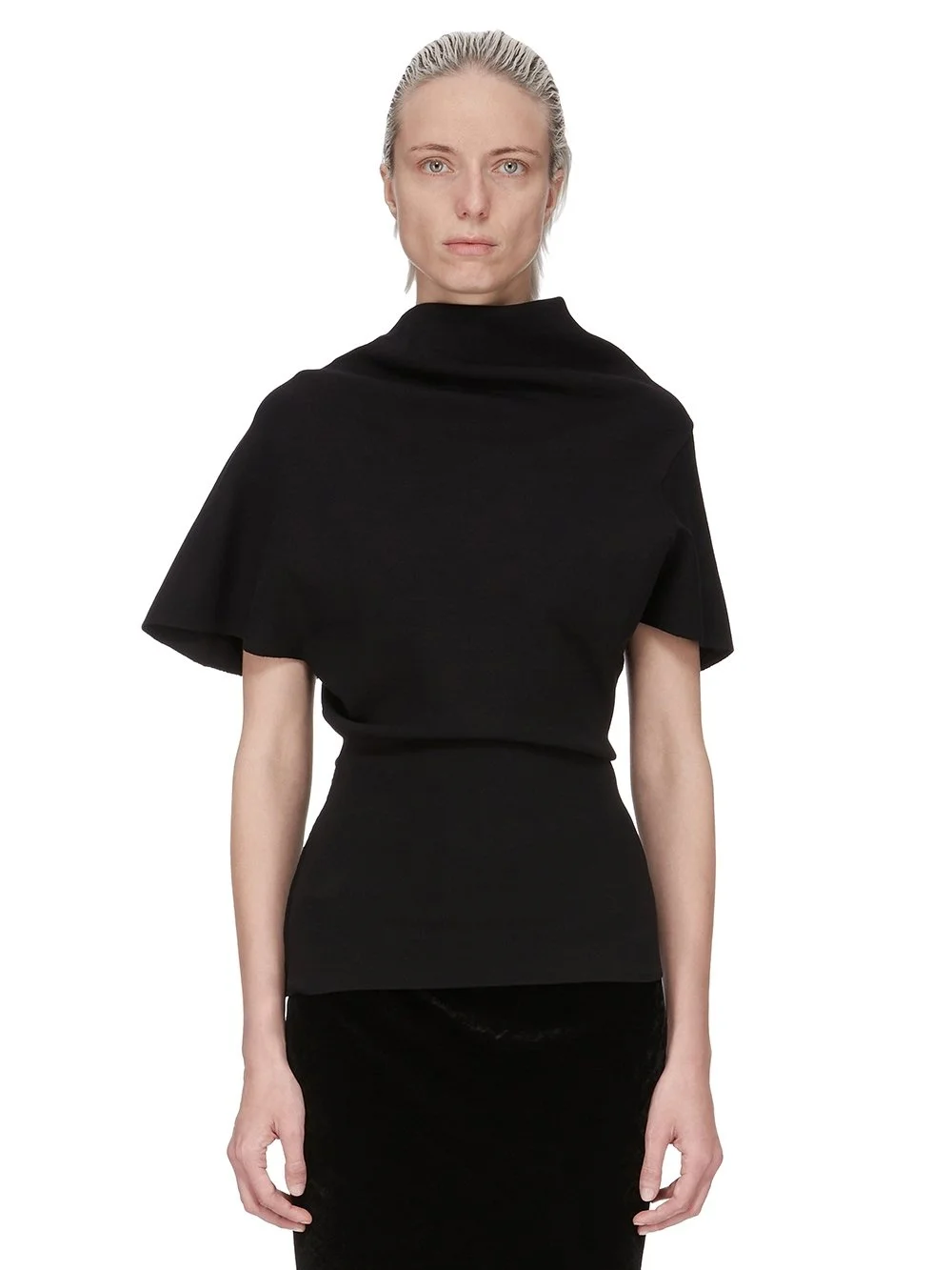 RICK OWENS FW25 CONCORDIANS DRAPED TOP IN BLACK STRETCH VISCOSE KNIT THIS DRAPED TOP IS ABOVE HIP LENGTH AND FEATURES A DRAPED COWL NECK THAT WIDENS INTO AN OPEN BACK NECK. IT HAS THREE BACK SEAMS THAT CREATE A SLIGHTLY OFF-CENTRE DETAIL WITH ABOVE-ELBOW SLEEVES, ONE REGULAR SHOULDER AND THE OTHER WIDER SLEEVE THIS MEDIUMWEIGHT VISCOSE KNIT IS COMPACT WITH A STRETCHY AND DRY HANDFEEL IT IS MADE WITH ECOVERO CERTIFIED VISCOSE WHICH ENSURES THAT THE FIBERS ARE PRODUCED FROM RESPONSIBLY MANAGED PLANTATIONS AND NO DEFORESTATION OCCURS COLOR: BLACK MATERIAL: 63% VISCOSE + 27% POLYESTER + 7% NYLON + 3% ELASTANE MODEL IS 181CM TALL MODEL WEARS SIZE S
