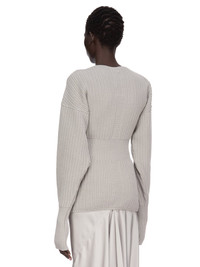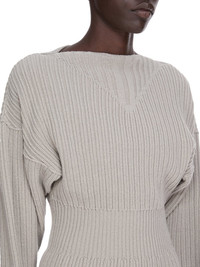 RICK OWENS FW25 CONCORDIANS DAFNE IN PEARL HEAVY WOOL KNIT THIS DAFNE IS BELOW HIP LENGTH WITH LONG SLEEVES. IT HAS A ROUNDED FIT WHICH CINCHES INTO THE WAIST WITH A WIDE RIB JACQUARD, A RAISED BOAT NECK, WIDE SHOULDERS AND LOOSE SLEEVES THAT NARROW TO SLIM CUFFS. IT FEATURES A MEGARIB KNIT DESIGN, WITH A WIDE VERTICAL RIB THE BACK AND FRONT BODY, AND DIAGONAL LINES RUNNING DOWNWARDS INTO THE CENTRE FRONT. IT HAS A VERTICAL RIB BACK WITH THE SIGNATURE KNIT CHANNEL RUNNING DOWN THE CENTRE BACK SPINE THIS A HEAVY WOOL FISHERMAN KNIT COLOR: PEARL MATERIAL: 100% NEW WOOL MODEL IS 181CM TALL MODEL WEARS SIZE S