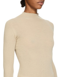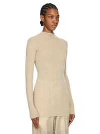 RICK OWENS SS26 TEMPLE LS TURTLE IN SAND RIBBED KNIT THIS LS TURTLE SWEATER IS BELOW HIP LENGTH AND A CLOSE TO THE BODY FIT. IT HAS A RIBBED TURTLENECK, HEM AND CUFFS. IT FEATURES ALL OVER RIB AND A KNIT LINE RUNNING DOWN THE CENTRE BACK SPINE THIS LIGHTWEIGHT AND CLASSIC RIBBED WOOL KNIT HAS A SOFT HANDFEEL COLOR: SAND MATERIAL:100% NEW WOOL MODEL IS 181CM TALL MODEL WEARS SIZE S