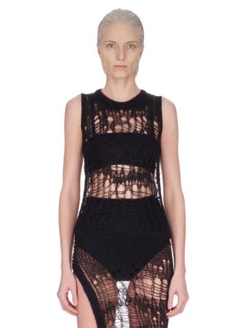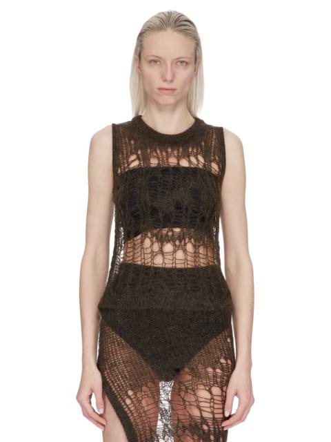 RICK OWENS SS24 LIDO SPIDER TANK IN HENNA NET KNIT THIS SPIDER TANK IS ABOVE-HIP LENGTH AND SLEEVELESS WITH WIDE TANK SHOULDERS AND A RIBBED ROUND NECK, AND RIBBED HEMLINE THIS IS A NET KNIT WITH UNEVEN HOLES- COLOR: HENNA - MATERIAL: 50% NYLON + 46% MOHAIR + 4% WOOL - MODEL IS 181CM TALL - MODEL WEARS SIZE S