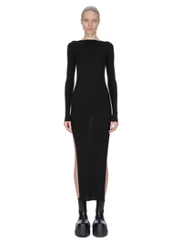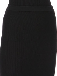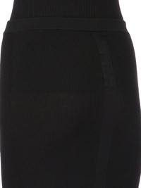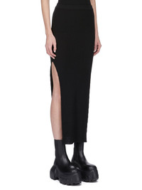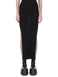 RICK OWENS SS25 HOLLYWOOD SACRISKIRT IN BLACK RIBBED KNIT THIS SACRISKIRT IS ABOVE-ANKLE LENGTH WITH A CLOSE TO THE BODY FIT. IT HAS A NARROW ELASTICIZED KNIT WAISTBAND, A TAPERED SKIRT WITH SIDE SEAM SPLITS REACHING TO MID-THIGH, AND A SIGNATURE KNIT LINE RUNNING DOWN THE CENTER BACK THIS LIGHTWEIGHT AND CLASSIC RIBBED WOOL KNIT HAS A SOFT HANDFEEL. COLOR: BLACK MATERIAL: 97% NEW WOOL + 2% NYLON + 1% ELASTANE MODEL IS 181CM TALL MODEL WEARS SIZE S