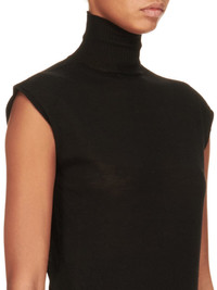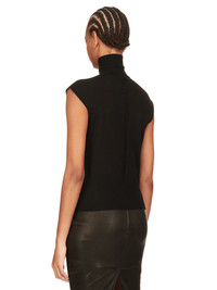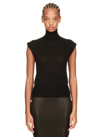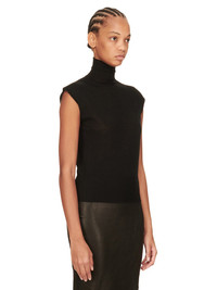 RICK OWENS FW24 PORTERVILLE SL TURTLE IN BLACK LIGHTWEIGHT RASATO KNIT THIS SL TURTLE IS ABOVE HIP-LENGTH. IT HAS WIDE SHOULDERS AND IS SLEEVELESS. IT HAS A RIBBED TURTLE NECK AND WIDE, RIBBED WAISTBAND, AND THE SIGNATURE KNIT CHANNEL RUNNING DOWN THE CENTRE BACK SPINE THIS IS A LIGHTWEIGHT AND SOFT CLASSIC STITCH WOOL KNIT - COLOR: BLACK - MATERIAL: 100% NEW WOOL - MODEL IS 181CM TALL - MODEL WEARS SIZE S