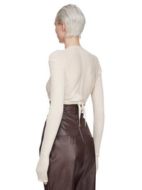 RICK OWENS SS25 HOLLYWOOD CROP WRAP IN DINGE LIGHTWEIGHT RASATO KNIT THIS CROP WRAP IS BELOW-BUST LENGTH WITH LONG SLIM SLEEVES. IT HAS A V NECK THAT DESCENDS INTO LONG TIES THAT ARE DESIGNED TO TWIST, AND WRAP AROUND THE BODY, TYING AT THE BACK THIS LIGHTWEIGHT AND CLASSIC STITCH WOOL KNIT HAS A SOFT HANDFEEL COLOR: DINGE MATERIAL: 100% NEW WOOL MODEL IS 181CM TALL MODEL WEARS SIZE S