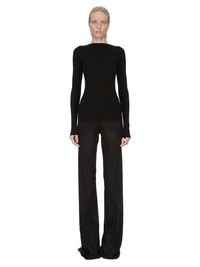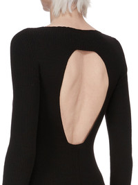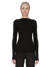RICK OWENS FW25 CONCORDIANS AL TOP IN BLACK RIBBED KNIT THIS AL TOP IS HIP LENGTH WITH A CLOSE FIT AND LONG SLEEVES. IT HAS A WIDE BOAT NECK AND A ROUND OPENING IN CENTRE BACK, WITH THE SIGNATURE KNIT CHANNEL RUNNING DOWN THE LOWER SPINE THIS LIGHTWEIGHT AND CLASSIC RIBBED WOOL KNIT HAS A SOFT HANDFEEL COLOR: BLACK MATERIAL: 100% NEW WOOL MODEL IS 181CM TALL MODEL WEARS SIZE S