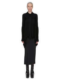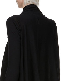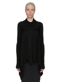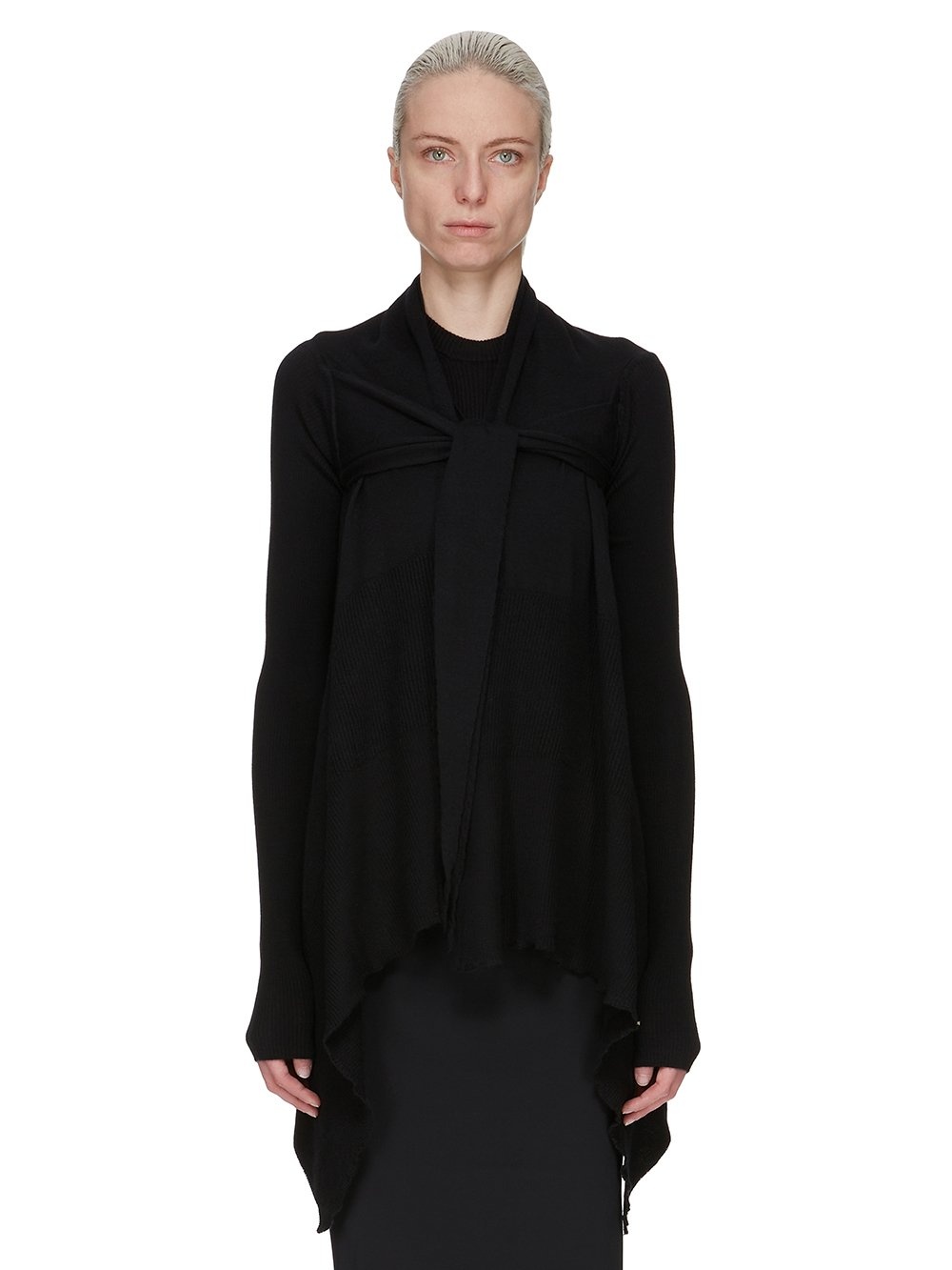 RICK OWENS SS25 HOLLYWOOD TIED MEDIUM WRAP IN BLACK LIGHT WEIGHT RASATO KNIT THIS TIED MEDIUM WRAP IS BELOW-HIP LENGTH AT CENTER FRONT AND BACK AND DIPS DOWN AT BACK AND SIDES. IT HAS A LOOSE FIT BODY AND LONG, CLOSE TO THE BODY, SLEEVES. IT FEATURES TIES COMING FROM THE FRONT ARMHOLES, THAT CAN BE KNOTTED CLOSED ACROSS THE BODY, OR LEFT HANGING OPEN. IT HAS A WIDE RIBBED KNIT BORDER AROUND THE HEM, AND THE SIGNATURE KNIT LINE RUNNING DOWN THE CENTER BACK SPINE THIS LIGHTWEIGHT AND CLASSIC STITCH CASHMERE KNIT HAS A SOFT HANDFEEL COLOR: BLACK MATERIAL: 100% CASHMERE MODEL IS 181CM TALL MODEL WEARS SIZE S