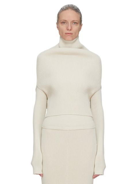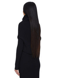 RICK OWENS FW25 CONCORDIANS RUNWAY LS COWL IN BLACK WOOL THIS LS COWL IS WAIST LENGTH AT FRONT, DIPPING SLIGHTLY LONGER IN BACK. IT FEATURES A DRAPED TUBULAR NECK THAT WIDENS OVER THE SHOULDERS CREATING A SHORT FITTED BODY WITH LONG SLIM SLEEVES. IT HAS A SIGNATURE KNIT CHANNEL DOWN THE SPINE COLOR: BLACK MATERIAL: 100% NEW WOOL MODEL IS 181CM TALL MODEL WEARS SIZE S