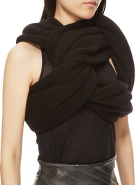 RICK OWENS FW24 PORTERVILLE TRIPLE DONUT IN BLACK RASATO CASHMERE KNIT THIS TRIPLE DONUT IS THREE INTERLINKED KNIT TUBES WHICH CAN BE WORN WRAPPED MULTIPLE WAYS AROUND THE BODY THIS MEDIUMWEIGHT RASATO CASHMERE KNIT HAS A SOFT WARM HANDFEEL COLOR: BLACK MATERIAL: 100% CASHMERE MODEL IS 181CM TALL ITEM IS AVAILABLE IN ONE SIZE