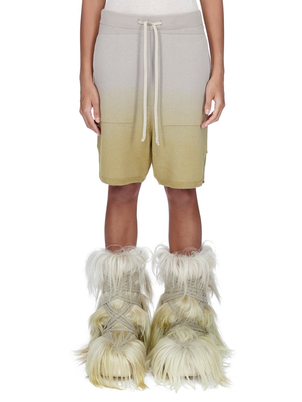 MONCLER + RICK OWENS FW23 LONG BOXERS IN ACID DEGRADE CASHMERE KNIT THESE LONG BOXERS ARE ABOVE KNEE LENGTH WITH A LOOSE FIT. THEY HAVE AN ELASTICIZED WAISTBAND WITH DRAWSTRING, A STITCHED FLY, SIDE SEAM POCKETS AND SPLITS IN THE HEM AT THE SIDE SEAMS. THEY HAVE A SMALL MONCLER + RICK OWENS LOGO ON LEFT THIGH THIS MEDIUMWEIGHT CLASSIC STITCH CASHMERE KNIT HAS A SOFT HANDFEEL - COLOR: ACID DEGRADE - MATERIAL: 100% CASHMERE - MALE MODEL IS WEARING SIZE XS, FEMALE MODEL IS WEARING SIZE M - MALE MODEL IS 189 CM TALL, FEMALE MODEL IS 181 CM TALL