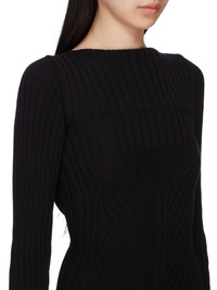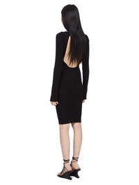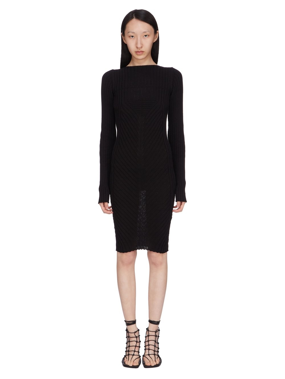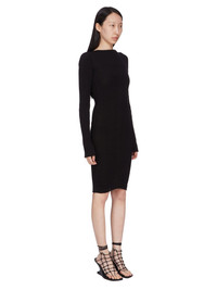 RICK OWENS SS25 HOLLYWOOD S DRESS IN BLACK MEGARIB COTTON KNIT THIS AL DRESS IS KNEE-LENGTH WITH LONG SLEEVES AND A CLOSE TO THE BODY FIT. IT HAS A BOAT NECK AND FEATURES A MEGARIB KNIT DESIGN, WITH WIDE RIB LINES RUNNING DOWN THE ARMS AND CHEST THESE LINES FINISH IN A SMALL RIB TRIANGLE, BEFORE DESCENDING INTO DIAGONAL LINES RUNNING DOWNWARDS INTO THE CENTER FRONT. IT HAS A VERTICAL RIB BACK WITH THE SIGNATURE KNIT CHANNEL RUNNING DOWN THE CENTER BACK SPINE THIS HEAVYWEIGHT COTTON IS KNITTED IN A WIDE RIB WITH A GRAPHIC MOTIF. IT HAS A SOFT HANDFEEL COLOR: BLACK MATERIAL: 100% COTTON MODEL IS 181CM TALL MODEL WEARS SIZE S