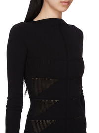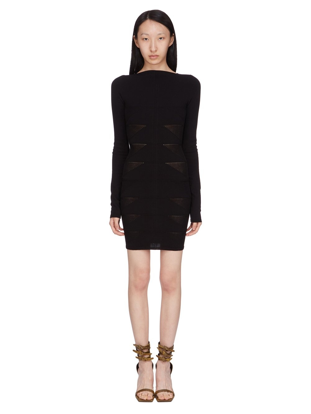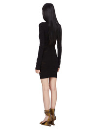 RICK OWENS SS25 HOLLYWOOD SHORT AL DRESS IN BLACK RASATO MOTIVO KNIT THIS SHORT AL DRESS IS MID-THIGH LENGTH WITH LONG SLEEVES AND A CLOSE TO THE BODY FIT. IT HAS A BOAT NECK AND FEATURES A MEGARIB KNIT DESIGN, WITH WIDE RIB LINES RUNNING DOWN THE ARMS AND CHEST THESE LINES FINISH IN A SMALL RIB TRIANGLE, BEFORE DESCENDING INTO DIAGONAL LINES RUNNING DOWNWARDS INTO THE CENTER FRONT. IT HAS A VERTICAL RIB BACK WITH THE SIGNATURE KNIT CHANNEL RUNNING DOWN THE CENTER BACK SPINE THIS MEDIUMWEIGHT VISCOSE RASATO KNIT IS KNITTED WITH A GRAPHIC MOTIF AND HAS A STRETCHY AND DRY HANDFEEL COLOR: BLACK MATERIAL: 68% VISCOSE + 32% POLYESTER MODEL IS 181CM TALL MODEL WEARS SIZE S